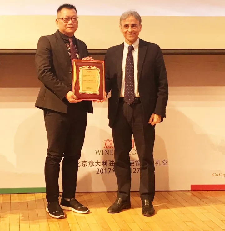意大利駐中國大使謝國誼先生(右)授歐其諾酒業(yè)“中國市場優(yōu)秀進(jìn)口商”牌匾