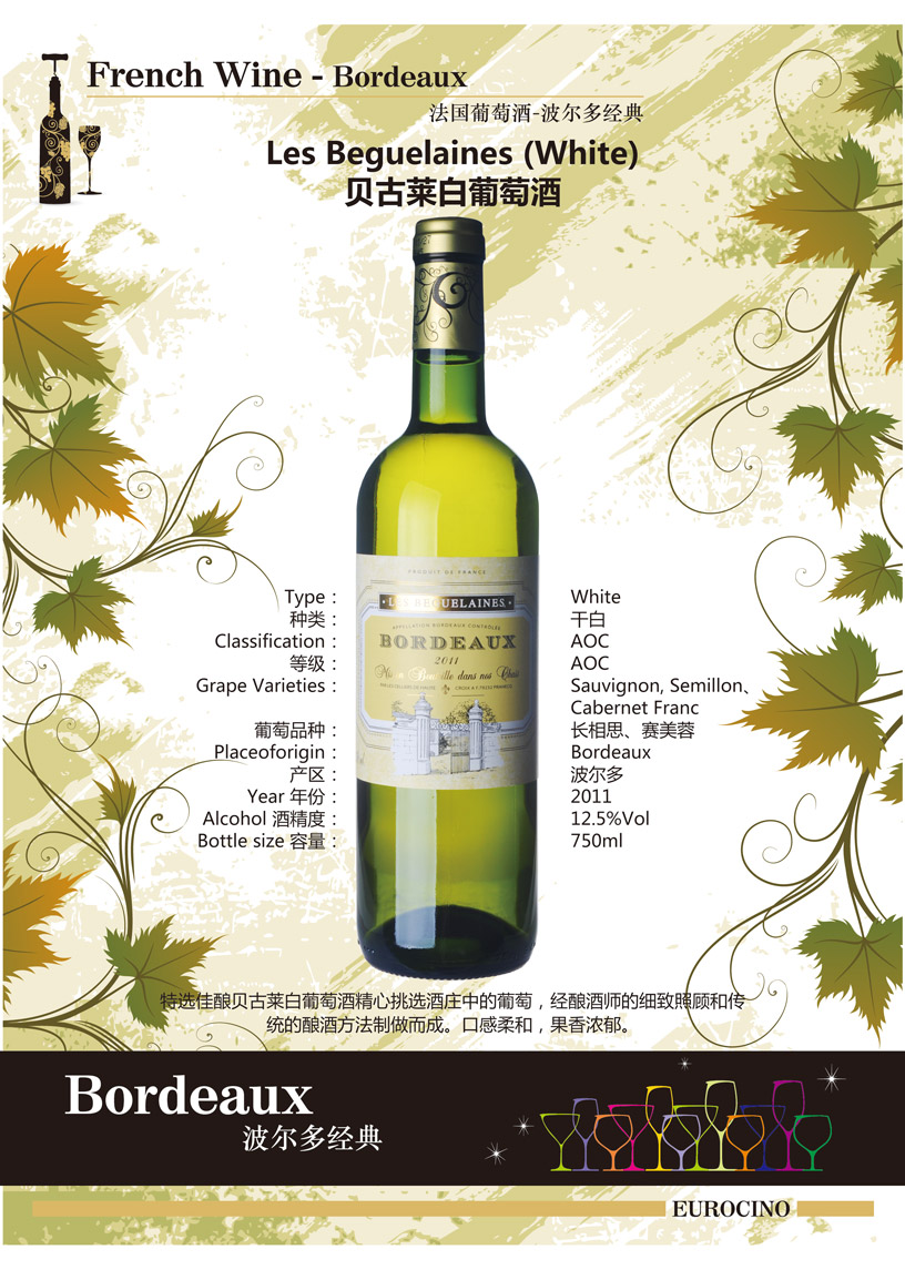 類型:干白 White 產區(qū):波爾多 等級:AOC 年份:2011 酒精度:12.5%vol 容量:750ml 葡萄品種:長相思 Sauvignon Blanc 賽美蓉Sémillon 品酒師品鑒:特選佳釀貝古萊白葡萄酒精心挑選酒莊中的葡萄,經釀酒師的細致照顧和傳統(tǒng)的釀酒方法制做而成??诟腥岷停銤庥?。
