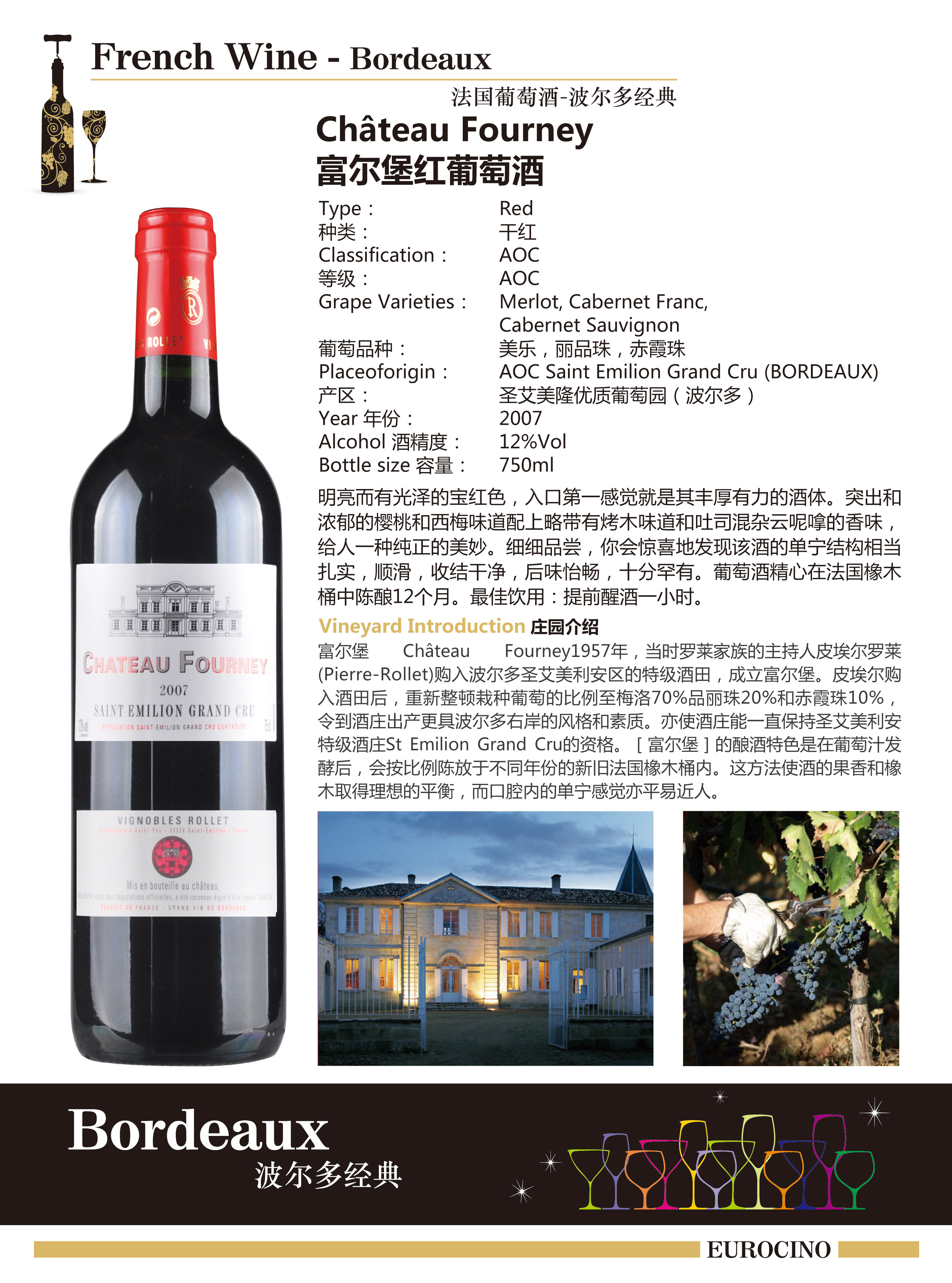 葡萄品種:美樂Merlot,品麗珠,Cabernet Franc,赤霞珠Cabernet Sauvignon