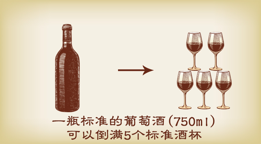 一瓶標準的葡萄酒是750ml,可以倒?jié)M5個標準酒杯
