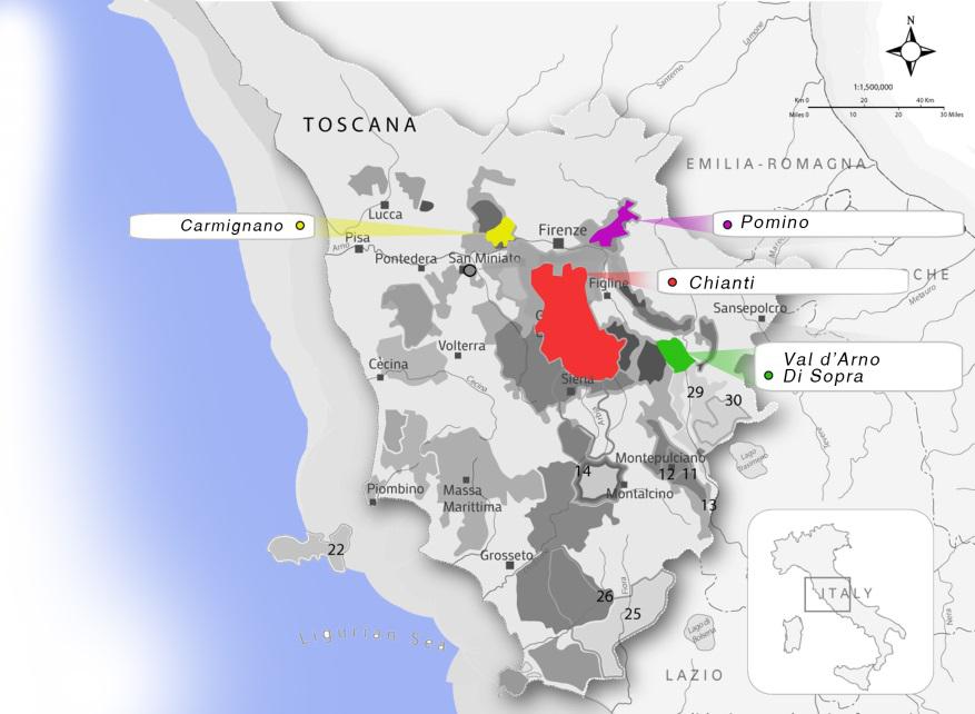 卡米諾亞(黃色區(qū)域)在托斯卡納產(chǎn)區(qū)的位置